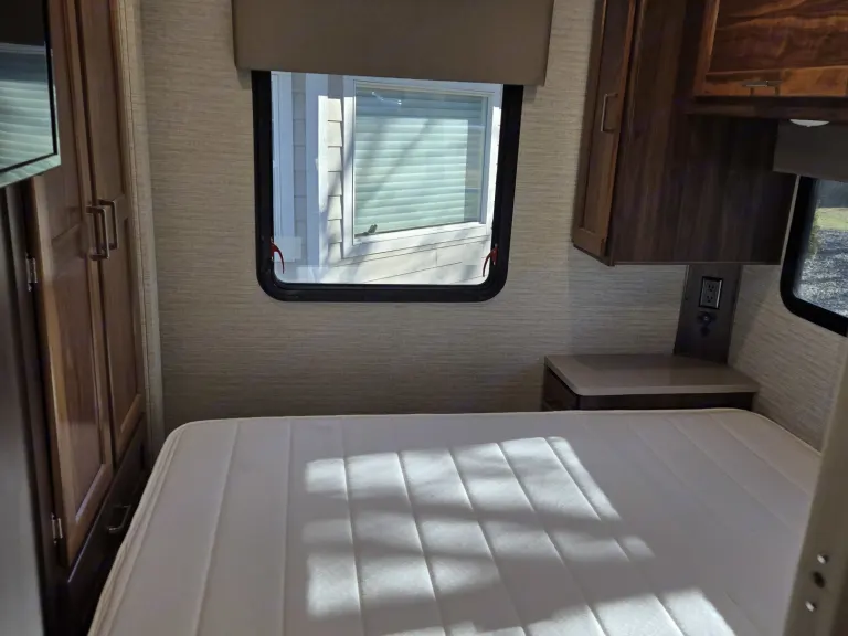 Inviting RV rental bedroom with a bright white mattress, wood storage, window with blinds, and ceiling vents.. Winnebago Minnie Winnie 2020