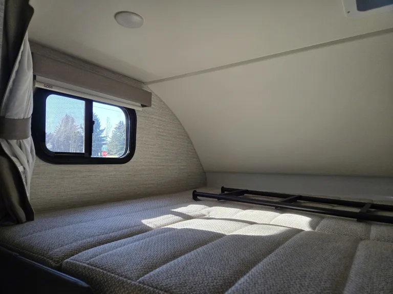 Inside an RV rental: overhead bunk bed with a blue skylight, flat-screen TV, and ladder on soft cushions.. Winnebago Minnie Winnie 2020