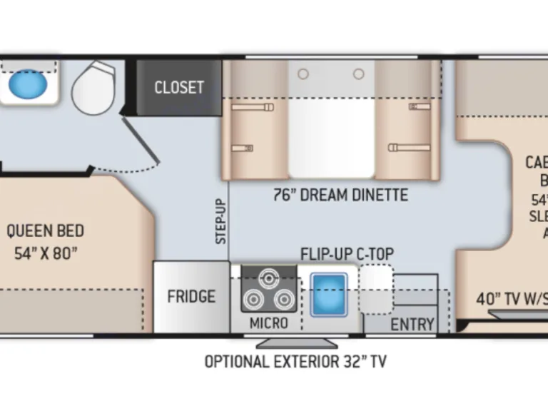 A brand new 2020 Chateau with all the modern day luxuries! This easy to drive family-fun-mobile is waiting for you to explore the great outdoors with no stress! Back-Up Monitor and Integrated Camera makes it easy for any level driver to operate. Hookup your cell to the Bluetooth for navigation or to stream your music. The built-in WiFi extender, 40” Smart TV with Netflix, DVD player with library, Hdmi&USB jacks, makes driving with the kids a breeze. The 40” Smart TV is mounted on swivel so it can be viewed from either the overhead bunk cabin, the dinette booth that also converts into another bed, or the rear queen bed.