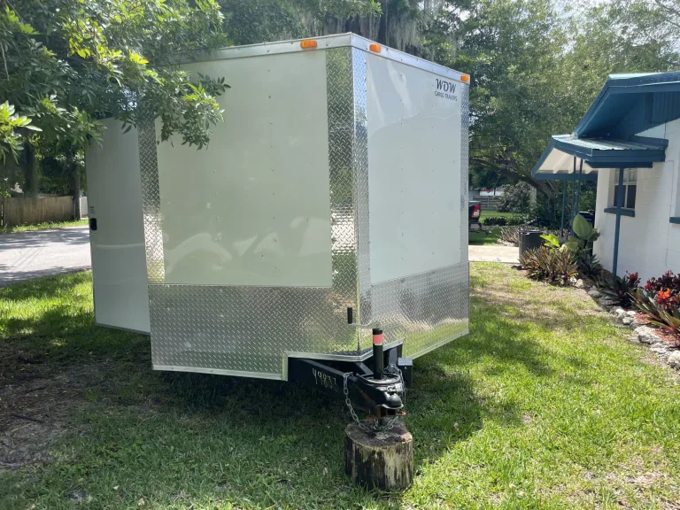 Basic v nose enclosed car hauler. Have 4 d rings in floor with plenty of space to fit extras around what your hauling. RecommendationsPerfect for the race car, or home moving, really anything. It’s a big open portable space. Other things to noteTake turns as wide as space will allow. Tight turns can damage axels.