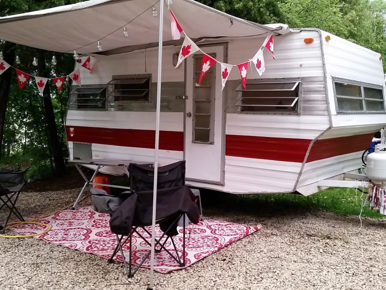Cute, renovated vintage travel trailer. Built in 1971 and remodeled in 2016/17, this trailer holds lots of it's original charm. Sleeps up to 4 adults as the back seating area pulls out to a double bed and the dining table can be lowered to fit two people. The kitchen is original with a propane/electric rv fridge and 3-burner gas stove top. Water must be hooked up as there are no storage tanks, grey water is a portable tank. There is plenty of storage for your clothes and other camping equipment. Includes a portable propane BBQ, propane, kitchen tent and 12 volt battery for campsites without electricity. Also includes plates, cups, utensils, and cook wear.