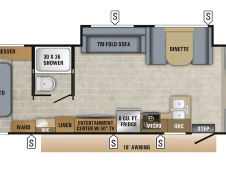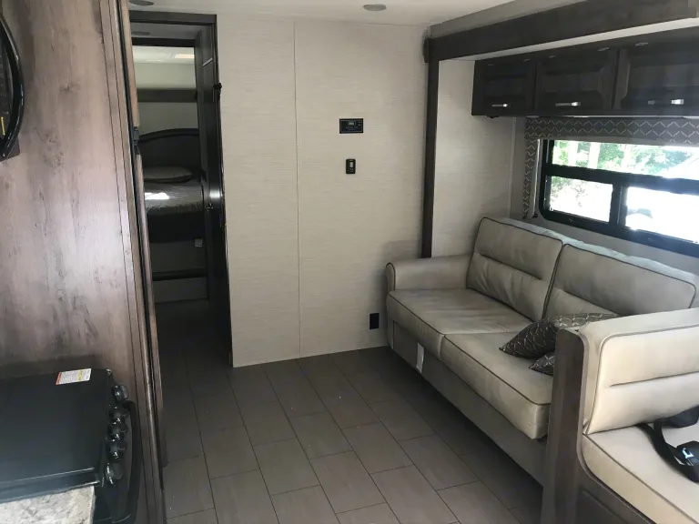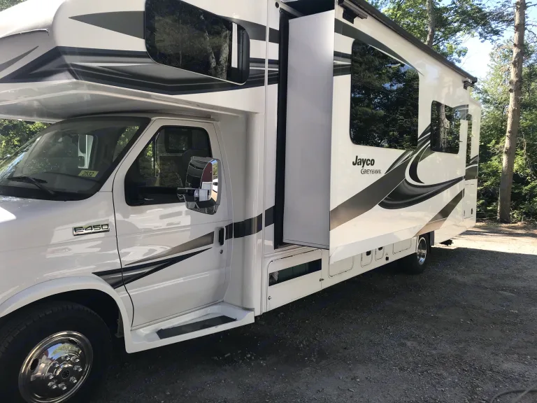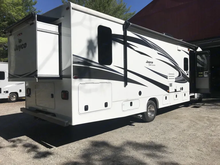 Start any road trip with this class C gas motorhome. You will love all of the at-home features throughout from the rear queen bed slide out and dresser in the private bedroom, the split bath's location and convenience, and the entertainment center including a 50" TV in the main living area. You can relax on the tri-fold sofa, dine at the booth dinette, and sleep on these furnishings once folded down. The cab-over bunk offers the kids a fun place to sleep.Get ready for a comfortable, fun traveling and camping experience with the Jayco Greyhawk class C gas motorhome. The fiberglass exterior has vinyl graphics, a seamless fiberglass front cap and a one-piece fiberglass roof. In the kitchen you will find beautiful elegant countertops, a stainless steel sink, and a Jayco-exclusive easy operation legless dinette table. This model has vinyl floors, high-intensity, recessed LED ceiling lights, and a residential microwave oven. This motorhome has the Customer Value Package which includes features such as the JRide Plus, the Infotainment dash radio with GPS & CD/DVD player, chrome remote-control, heated sideview mirrors, and more! What are you waiting for, come enjoy the ride with a Greyhawk!What's includedFresh bed linens (flat & fitted sheet) reusable plates and cups for 6 people, and utensils.Other things to notePet friendly.