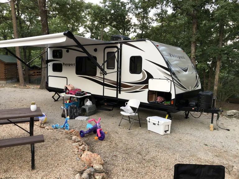 Are you new to camping or looking to get away with your family without the cost of RV ownership? This camper is for you. This camper is less than one year old and still looks and lives like it is brand new!This small but mighty camper can sleep 5-7 people. It is equipped with a Murphy bed that is a camper queen and has a dreamy memory foam topper. The Murphy bed allows for more living space and a comfy couch during non sleeping hours. This camper has "double" size bunks making them comfortable for adults or children. The kitchen dinette also makes out into a bedThis camper has a shower/bath tub combo that has a skylight that allows for extra lighting and extra head room if needed. The bathroom is also equipped with a vent, toilet, sink, and mirror with medicine cabinet .The kitchen features a refrigerator with freezer, three burner gas stove, gas oven, microwave and plenty of cabinet space. It features the dining table on the campsite side with an extra large fireside window so you can watch your family playing outside or enjoy viewing Your campsite while enjoying your morning coffee instead of staring at your neighbor!There is a television mounted in camper that allows you to watch TV using the built in antennae and there is also a Blu-Ray/DVD player included for your use.Outside features includes a large power awning, LED lights, Bluetooth stereo with outdoor and indoor speakers, outdoor kitchen with two burner stove and mini fridge, outdoor sink, outdoor shower plus more.Linens, blankets and some basic essentials (basic cookware, coffee maker, toaster, toiletries, trash bags, etc.) are included with your rental! Fresh water hose and filter will also be included.Make memories that last!