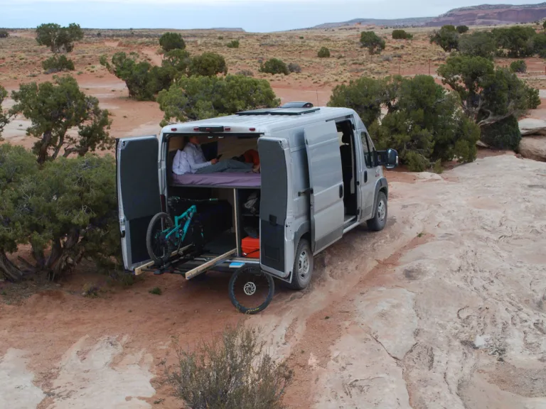 - Full size bed positioned perpendicular to van length to maximize space - super comfy!