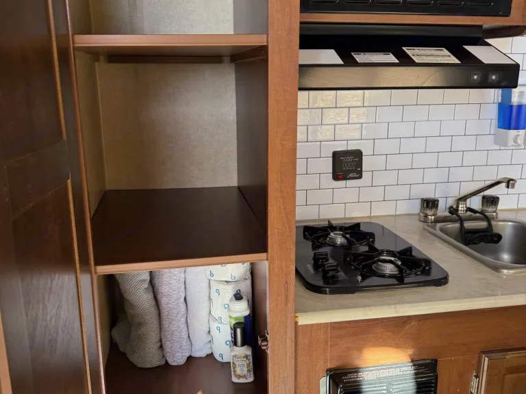 • Fully stocked kitchen with sink, 2-burner cooktop, microwave, and refrigerator