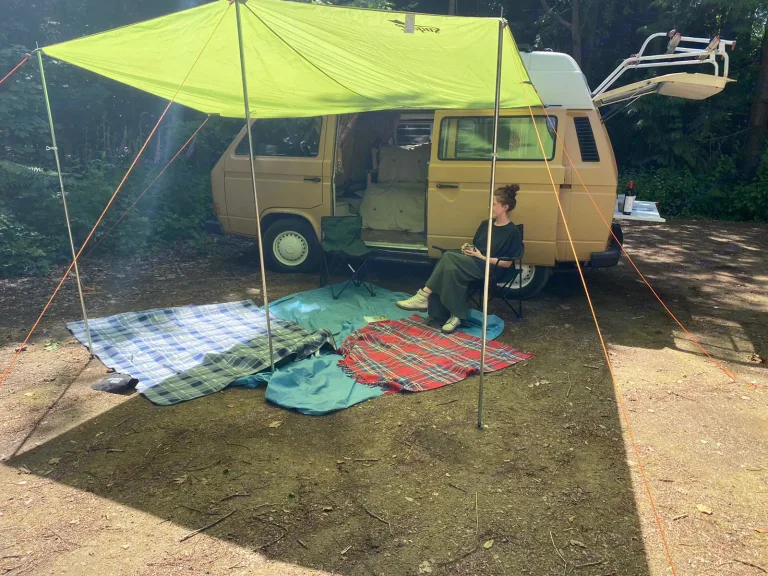 *No longer taking bookings on Outdoorsy until they correct many issues on their website and app* Please try Camptoo or Yescapa or Fatllama or Google instead.Our cherished VW camper Myrtle is all ready and bristling for your adventure into nature. She's in fine working order purring away with that classic VW piston sound.The van has been designed with your holiday experience in mind - with a recent service and MOT to give you full peace on the road. It's easy to fall in love with the cute character and smart and considered design - almost everything is multi-functional - the front 'captain' chairs spin to create a lounge and part of the bed, the bamboo sofa rock'n'rolls out to be other bed section, the boot becomes an external dining table, the guttter hooks up to the awning, and the 240v plugs run off the solar or can easily hooked up to a campsite mains for more extensive use. On the road with the standard jack an ipod or phone hooked into the 4xspeaker system, and with beers chilling in the PV-powered electric fridge you'll be all set to go.When parked up in your idyllic spot, kick back with: