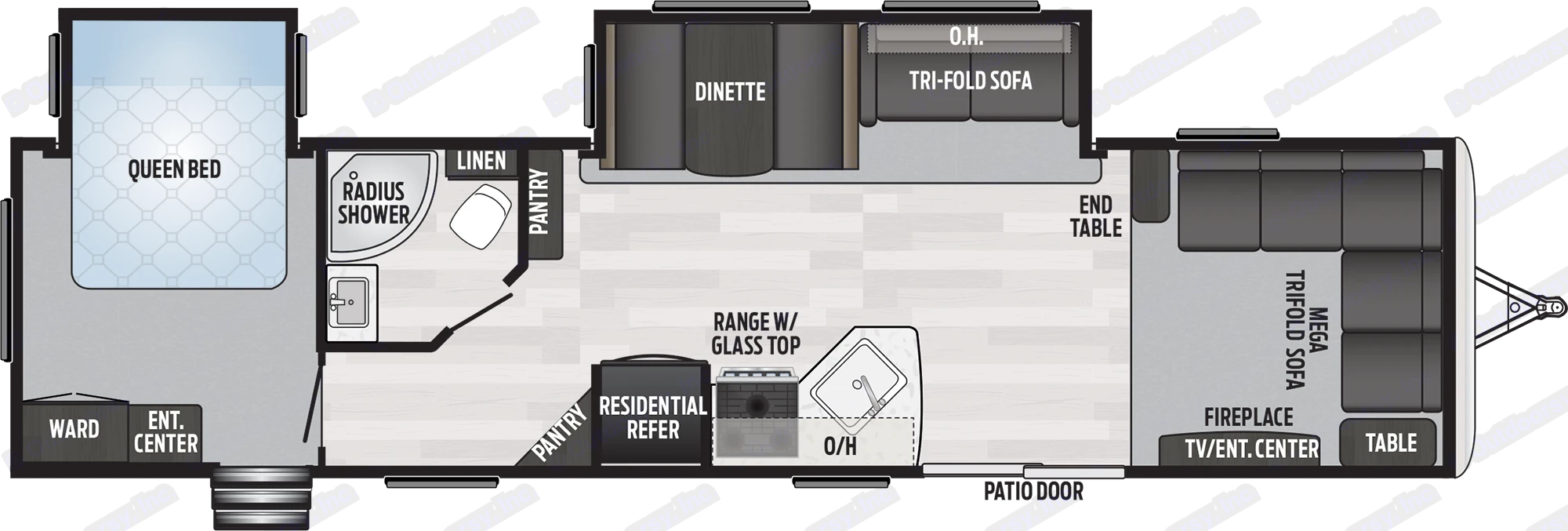 Rent this spacious 38ft travel trailer which includes a full size fridge, fireplace, TV/Radio/DVD player, outdoor speakers, large awning with led lights, and comes completely stocked with linens, cookware, dishes, keurig coffee machine, and more. The bedroom has a door and there is a pillowtop upgrade to the mattress. There is a door to the outside in the master bedroom and a sliding glass door in the living room. Both the loveseat and the wrap around couch will turn into full and queen sized beds. The dining table will also convert to a bed. There's plenty of storage too. There are 2 slide-outs making this camper feel very spacious.Delivery/Setup is available: