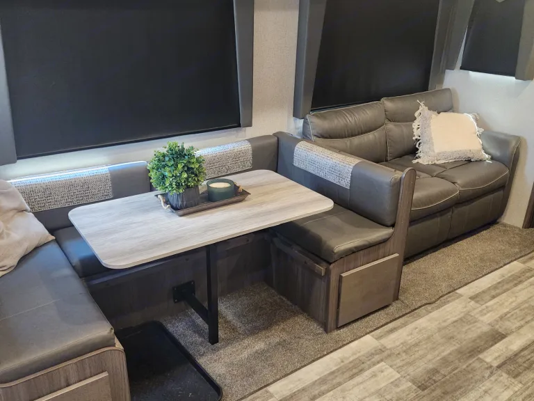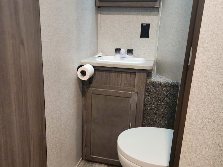 It features a beautiful and modern interior design with a large living area, a fully equipped kitchen, and a cozy bedroom, and a fun bunk house that's great for kids. The RV is equipped with all the amenities you need for a comfortable stay, including air conditioning, heating, a fireplace, a TV, and a sound system. The two slide outs provide plenty of room for everyone to relax and enjoy their vacation. The outdoor kitchen has a mini refrigerator and a small griddle. This area is perfect for hosting barbecues and enjoying the beautiful weatherWhat's includedThe RV will be provided with- Bottled water