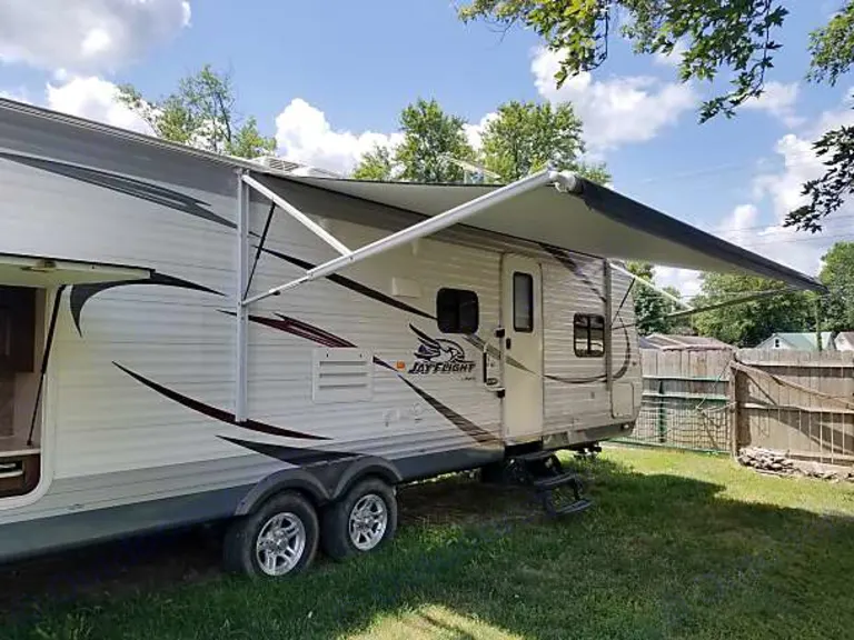 Beautiful 29 foot travel trailer for rent. It is 29 feet long with a 12 foot electric slide-out. It has tons of room once you open the slide-out. It has a bunkhouse in the back that sleeps 3, a queen bedroom that sleeps 2, a couch that sleeps 2 and a horseshoe table that seats 6 and sleeps 2. This RV will sleep 8-10 comfortably. It has a 32" flat screen TV and DVD. It also has a CD/surround sound with AM/FM radio with outdoor speakers. It has great Heat and A/C, a 3 burner stove, hot shower, microwave, sink, outdoor kitchen with fridge/sink and 2 burner stove, outdoor shower along with electric tongue jack and electric stabilizer jacks. There is also a separate propane grill with propane tanks available.Units dry weight is 6500 lbs with a 695 lb tongue weight, 3000 lbs cargo capacity. A truck with a towing package with a 2" receiver /7pin plug and brake controller is needed. Suggested truck size would be F250 and up or Chevy/Dodge 2500HD. I will provide the hitch and leveling,sway bars. Many other setup amenities included for leveling and stability while parked.Unlimited Wifi while your traveling! Don't forget to ask me how!Great time for the whole family. Book today!