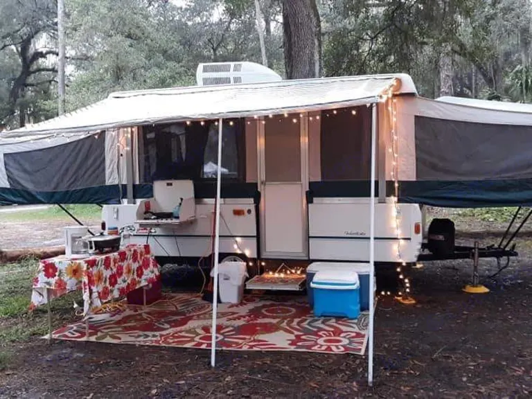 Have all you need to have a wonderful camp experience. Inside shower, toilet, and changing area Cool fridge, AC, Included with rental a full set of dishes, pots and pans, coffee maker, cups, bowls, plates, and silverware. Awning comes with a screen room attachment and roll out porch so you can enjoy your weekend in comfort any time of year.