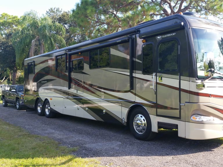 Enjoy traveling in comfort and style in a beautiful 42 ft. Fleetwood Providence. This RV has everything you need to dry camp off the beaten path or high-end class A only campgrounds. It has a 450 HP Cummings Diesel with an automatic Allison Transmission and Freightliner Chassis. This big-rig has all the amenities of home, king size sleep number master suite and a pull-out air bed in the living room. Three air A/Cs to keep you cool, full-size residential fridge, built in dishwasher and fireplace, large convection microwave and cooktop. Aqua Hot instant-hot water so you never run out while using the roomy shower or doing your laundry in the built-in washer and dryer. 4 flat screen televisions with one outside for tailgating or watching a scary movie around a gas fire pit provided and connected to the RV.Discounts for bookings 7 or more days, additional discounts for 29 or more days.If you have a dog or dogs, we can consider the possibility. Cats are not ok. Send us a message to describe your dog(s) and we will take that into consideration.If your concerned about driving a big rig, then we can also talk about delivery to your camp site and setup. This would be based on the number of miles we need to drive to deliver the RV.