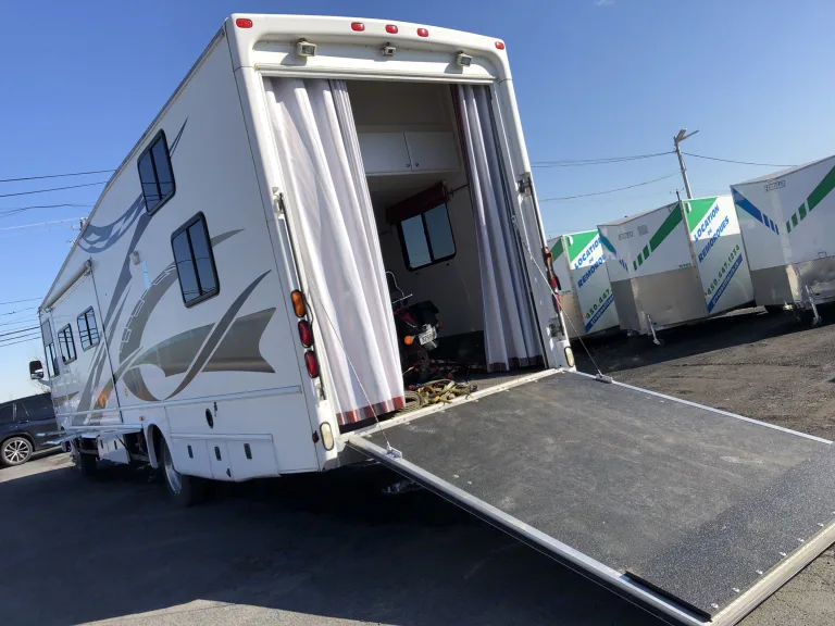 This Class A RV has a garage in the back and a GM 8.1 Workhorse engine, very strong and reliable.This is a perfect vehicle for a family who need wheelchair accessible vehicle or who wish to bring either 2 motorcycles, a small car, a 4 wheeler, a golf cart, etc.4. Electric furnace with a fireplace look5. Slide-out which allows to have tons of space in the kitchen / living room.6. Outside shower.7. Fuel pumping station to fuel any vehicles brought in the garage.8. Electric levelling jacks for unleveled lands.9. Digital TV for the living room.10. Option, possibility to lease up to 2 motorcyclesPlease note that this motorhome is 38 feet long, 13 feet high and 8 feet and half wide. Although this vehicle doesn't require a special license, it is very big to drive and only experienced drivers will be allowed to rent it.