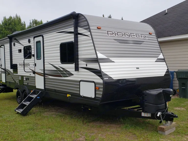 Note: Camper will be cleaned and sanitized in accordance with CDC guidelines prior to trip.New 2020 model, family friendly with 5 beds that can sleep 8 comfortably or up to 10 with doubling the kids in the bunks! Plenty of amenities and conveniences like the heavy duty steps on the main entry, secondary entry into the bathroom, rear fold down rack for luggage, bikes, coolers, etc. This camper if fully outfitted and ready for your outdoors getaway! We also offer delivery and pick service and set up and pack up convenience.Other amenities include outdoor shower, portable gas grill, flat screen tv and dvd, popular family card games, fold up chairs (4), upgraded shower wand, plenty of linens and pantry storage for groceries!Note: This is a non-smoking camper. Please do not smoke inside, in the doorways or within 10' of doors or open windows. Smoking inside or around will result in loss of portion or all of deposit to cover cleaning/reconditioning costs.Pet Policy: Small breed dogs are welcome, we ask that larger breed dogs have their own bed accompany them and are not allowed on furniture. Cats and other animals are prohibited.Delivery Only within 60 miles of Brunswick, Georgia. We apologize but we no longer offer customer towing. We will deliver, set up and pick up for a competitive fee.