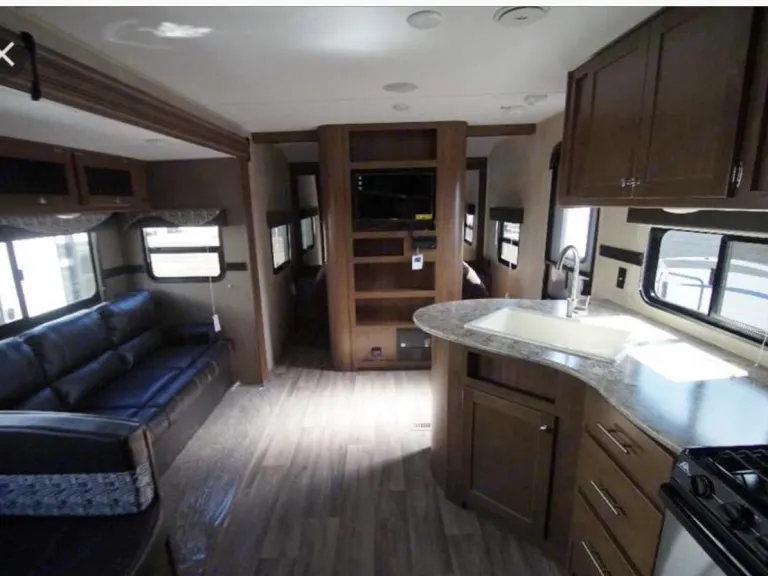 Step inside and enjoy a wide open space thanks to the large slide out sofa and u-dinette opposite the door. There is an entertainment center along the interior wall for easy viewing throughout this space. On either side of it you will find sliding doors allowing access into the front master bedroom. Here you will enjoy a queen bed, dual shirt closets, and an overhead shelf for added storage.Along the curb side wall there is a double sink, three burner range with overhead microwave, a refrigerator, and closet/pantry.Along the rear of this Aspen Trail you will find a convenient bath including a tub/shower, toilet, and vanity with sink. The opposite corner features a double size bed set of bunks for the kiddos or guests.Outside beneath the bunk area enjoy an outdoor kitchen which features a refrigerator, single sink, and two burner cook-top, plus so much more!The trailer is equipped with pots,pans,plates,cups, blankets, pillows, and bedding.