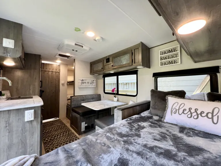 The dining area converts into a sleeper as well. This trailer is 4700 lbs and can be easily towed to your destination. We offer delivery and hookup in all areas within an hour of downtown Austin. There is a sink, microwave, gas range, and refrigerator along with an indoor/outdoor radio. There is ample storage space around the RV, and if you don't need both bunks, one can be used for additional storage as well. Led exterior lights, tinted windows, power awning, solar panel & outdoor shower. When inquiring about booking, please include details as to your experience level with pulling trailers and camping with trailers. We do prefer to rent to people with experience only. What's includedWhite folding table, 2 camping chairs, an outdoor expandable garbage can, and a laundry drying rack. There is also a gas burner stove that can be used outdoors, a coffee machine (a traditional machine that takes filters), a blender, & basic cooking supplies. We also have a large, outdoor fan that can be used as well! RecommendationsWe would prefer for our setup to be used here locally in TX. We are new to renting and also prefer renting to people with previous trailer and RV experience. If you have any special requests or needs, please feel free to run it by us! Other things to note*No pets allowed