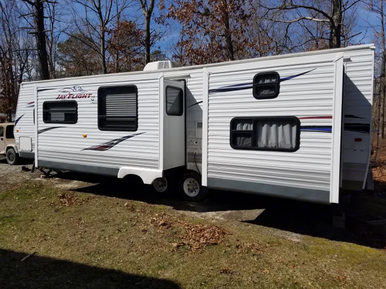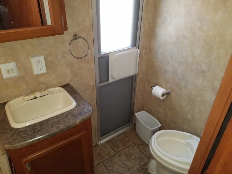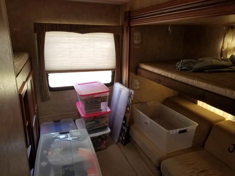 Double slide with separate enterace to bath. U shape dinet that opens to bed. Couch also opens to bed. Lots of room . Bunk house in rear with single bunk and Jcube bed opens to full and oversized bunk. Lots of a storage. Electric awning. Indoor/outdoor speakers. Private master with tv that spins around from living room. All the amenities of home.