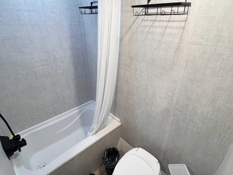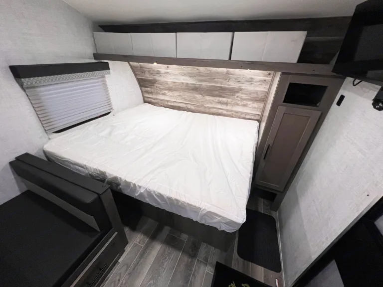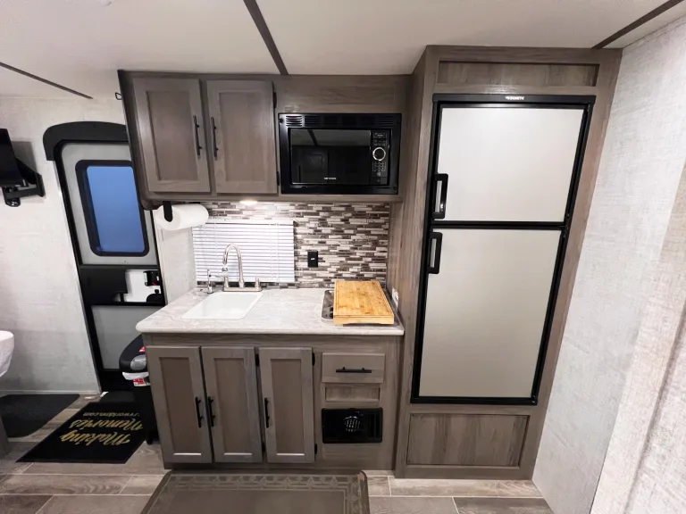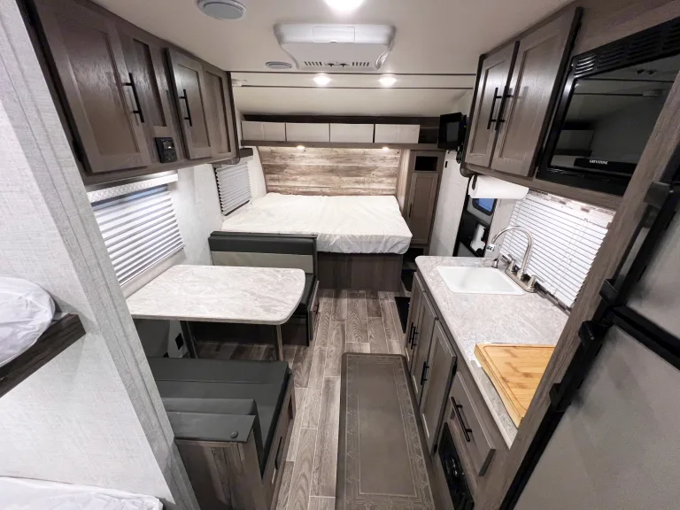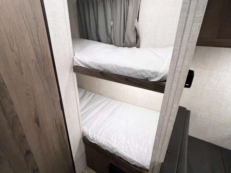 Interior: This camper has a kitchen with a full sized refrigerator, a queen size bed, bunk beds, and a dinette that can convert to another sleeping area if need be. The bathroom has a tub, which makes it a great bonus for families with small kids or pets.