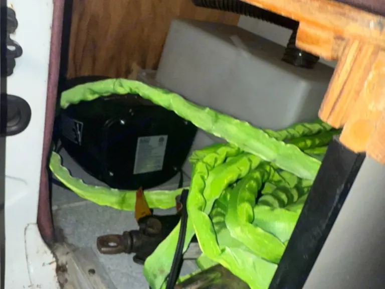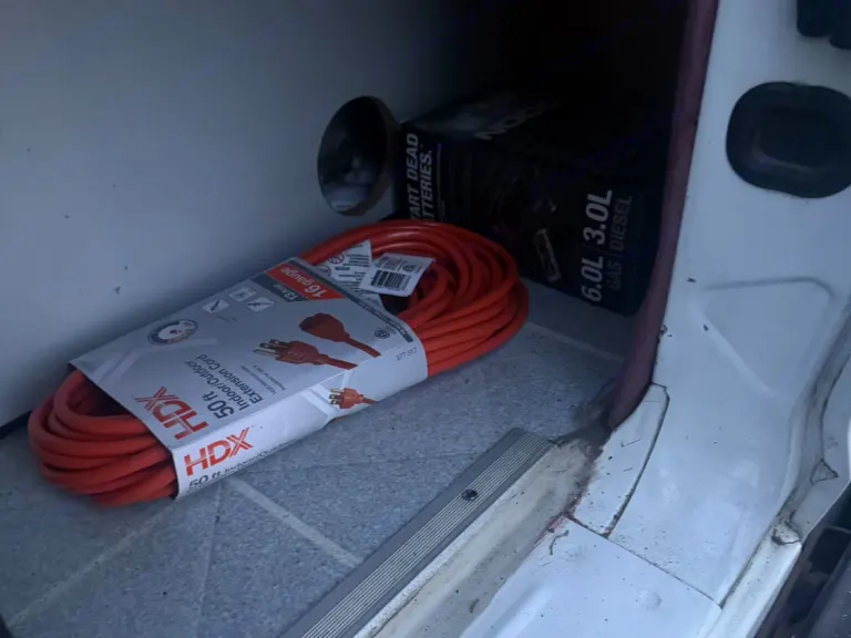RV rental under-bed storage: water tank, heater, green strap, & tools. Essential utilities for van life camping.. Dodge B Van 1998