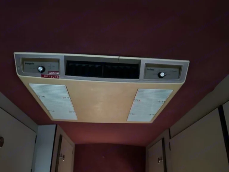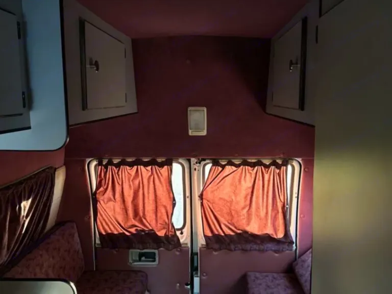 RV rental bunk bed with a light blue blanket, rolled black bag, window, and fire extinguisher below. Ready for adventure.. Dodge B Van 1998