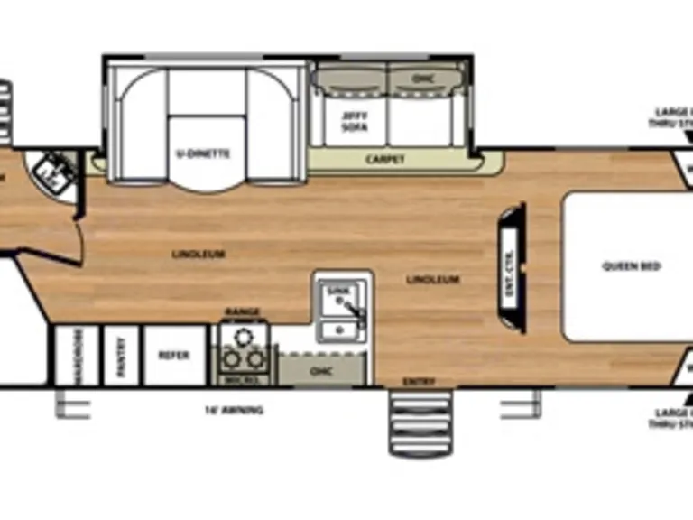 Katelyn and Jake's Kid Friendly BunkhouseWelcome to our 2015 Forest River Vibe Extreme Lite 272BHS travel trailer, which consists of a master bedroom, a single slide and a rear bunk house.Once you step in the trailer there is a double kitchen sink, three burner range, microwave, refrigerator, pantry, and wardrobe. On the opposite side of the trailer you will find a slide with a dinette which converts to a bed as well as a sofa that folds out into a bed. Also in this area is an entertainment center where the TV swivels from the main area to the master bedroom.In the front bedroom there is a queen bed with wardrobes on either side of the bed, and a storage area under the bed as well. There is a storage hatch on the right of the bedroom which conveniently opens to the full pass thru storage below.As you proceed toward the rear of the travel trailer, the double bed bunk house is on the left side. On the right side is the bathroom. Inside the bathroom you will find a toilet, tub, a skylight above the shower, a sink, and medicine cabinet. There is also a private entrance from the bathroom leading outside.Outside you can enjoy the exterior kitchen which includes a sink and refrigerator, a gas grill, and an outdoor shower.