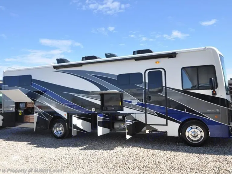 Adventure Awaits. Spacious and comfortable, this RV sleeps 8. Fully stocked - includes linens, dishes, cookware and utensils, the unit also features a full size refrigerator with an ice maker, spacious kitchen, and abundant storage. Two large slide outs and bunk beds make for a perfect family vacation. This RV also has an outdoor kitchen (sink and refrigerator), outdoor shower, outdoor television (4 tv's total), an electric awning and auto-leveling jacks.