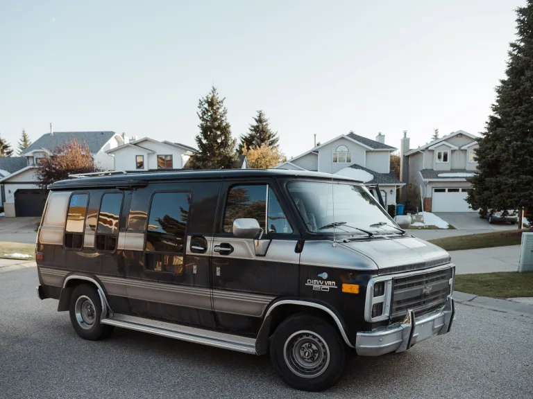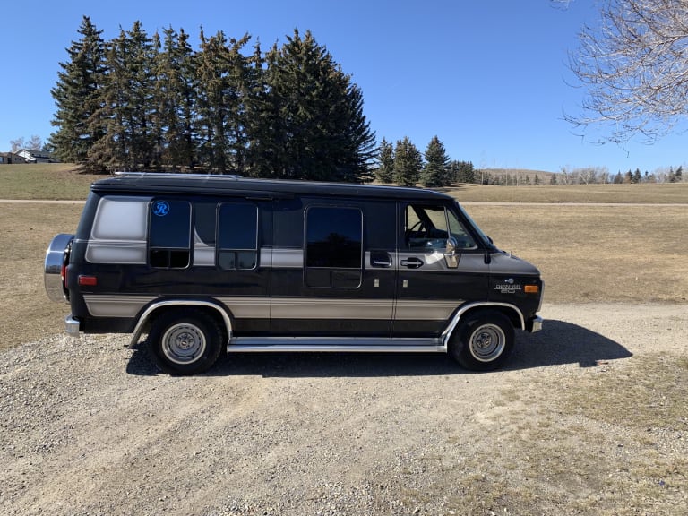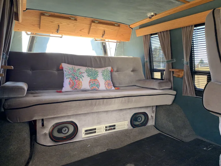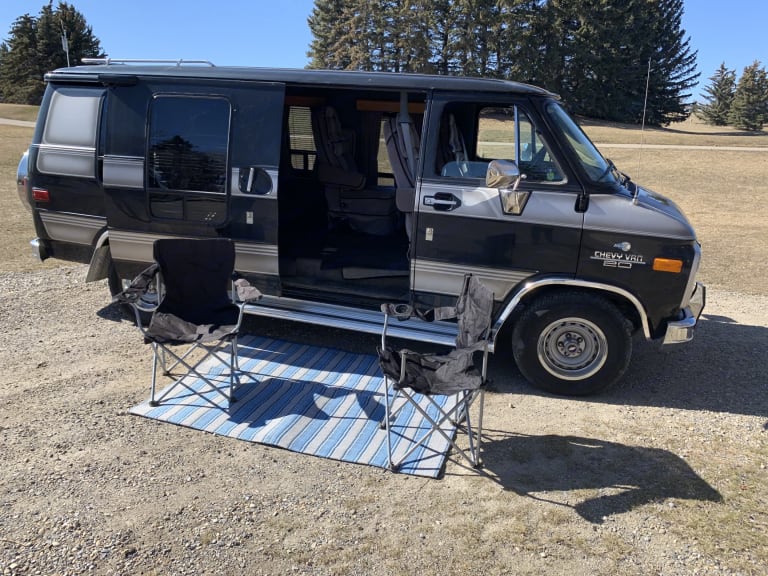 Take a trip back in time with this classic camper van in great condition. Built in 1985 this van is a blast from the past, with blue velour interior, oak finish and an AM/FM radio/tape deck (comes with an adaptor for your iPhone). What more do you need?