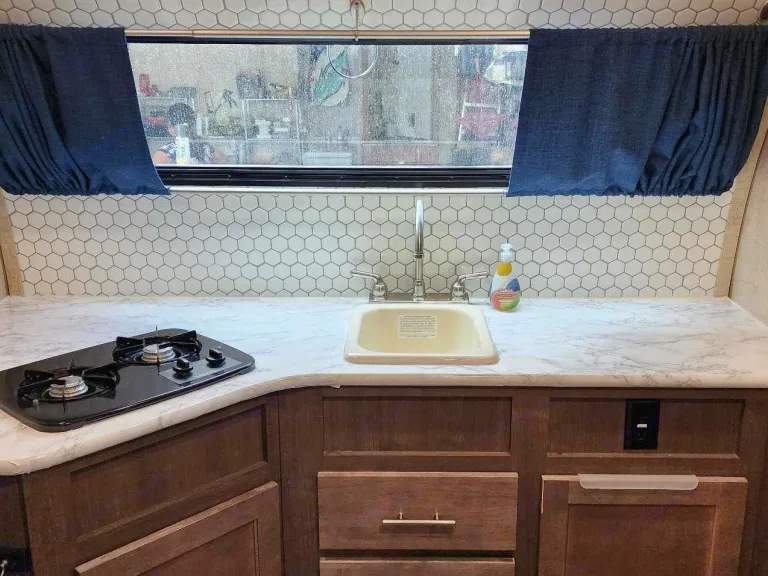 •Kitchen -Massive counter top space, 2 propane burner stove, 3-way fridge, convection microwave, sink and ample pantry space.