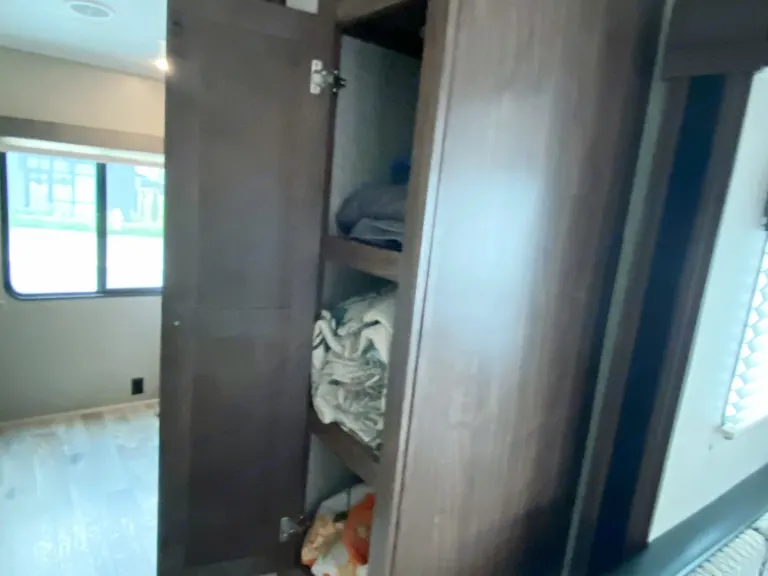 This trailer has 2 slides out which gives a nice open feel to the kitchen dining space and bunk beds area.