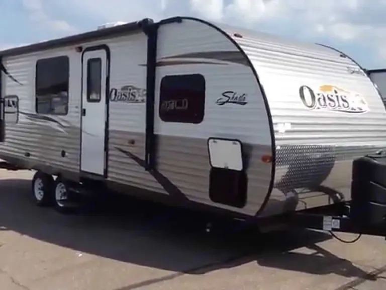 This Shasta Oasis bunkhouse model 25RS features a rear bath, rear bunks, and a large single slide for added interior space and it's easily towable with any 1/2 ton pick up truck or large SUV