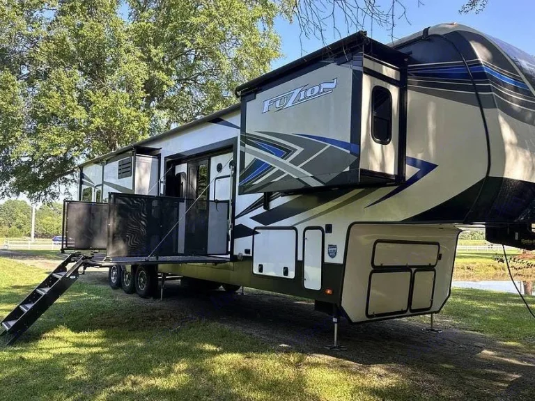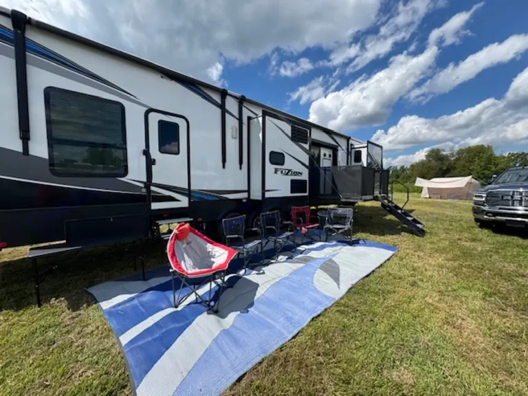 Spacious. Luxurious. Ready for Adventure!This brand new Fuzion Toy Hauler is built for comfort, fun, and functionality — featuring 2 party decks and tons of room to relax or entertain.13-ft garage with room for all your toys — It includes two queen beds, one of which converts into a dining area with a table or lounge space.The living room boasts an oversized reclining couch with heat, massage, LED lighting, and USB ports for next-level comfort.A counter bar with four swivel chairs provides extra seating for meals or hangouts.There's even a loft above the kitchen — perfect for extra sleeping space or storage.Enjoy the convenience of 1.5 bathrooms, including a half bath in the garage.Equipped with 4 TVs, a residential-size fridge, microwave, stove, Keurig coffee maker and even an air fryer — you'll have all the comforts of home on the road.Whether you're hitting the trails or just unwinding, this hauler delivers serious space, modern luxury, and endless possibilities for fun and unforgettable memories.What's includedIncluded with your purchase: