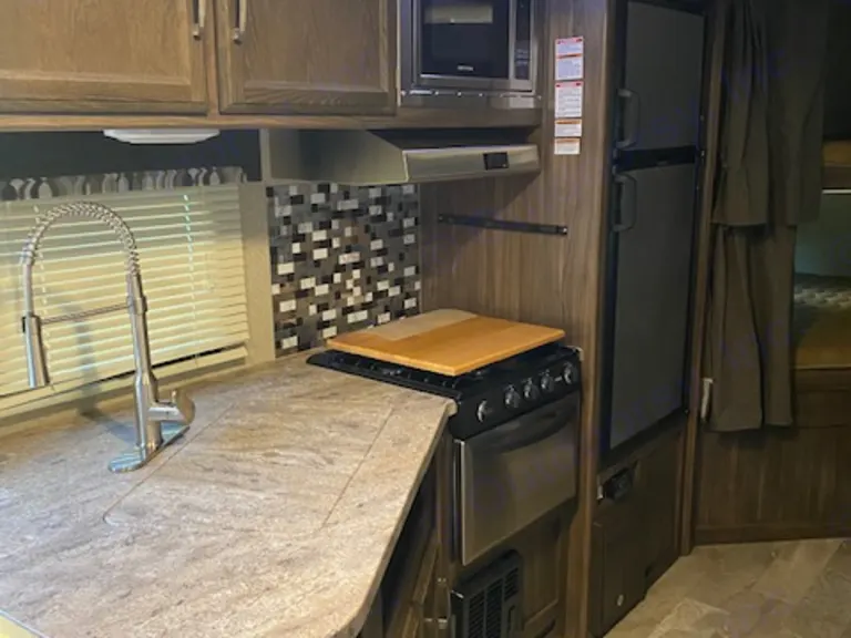 This 24' camper can sleep up to 6 people. It has a master queen bed separated with slide doors from the living area, two overlarge bunk beds and a large dinette that converts into additional sleeping quarters to accommodate two adults or children. It has one slide out to make the area spacious, an electric awning with lights, a Stereo with speakers inside and out, as well as an outdoor kitchen with cooking station and mini-fridge. This small camper is great for towing and will make for a great experience for you family in the great outdoors.What's includedCookware, dishware, utensils.Other things to noteUp to 2 Dogs can stay with a $50.00 Charge Each