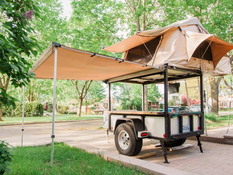 Location de trailer prêt-à-camper pour tes prochaines vacances!En louant un trailer, voici ce qui t’attends :-Une tente Smittybilt XL qui laisse amplement d’espace pour 4 personnes, soit l’équivalent d’un lit king. La tente est déjà équipée d’un matelas super épais et confortable et elle se monte en 5 minutes.-Dormir sur une plateforme surélevée, à l’abri des petites bibittes indésirables.-Une glacière XL (assez grande pour 188 cannettes !) déjà remplie de glace.-Beaucoup d’espace de rangement ! En fait, assez d’espace pour trimbaler tout ce dont tu auras besoin en camping : chaises, table, BBQ, vélos et plus !-Du bois de chauffage et d’allumage.Le trailer est aussi ulta-léger (750 lbs). N’importe quel véhicule qui a une barre de remorquage peut le tirer. Il a aussi été conçu avec des essieux indépendants et des roues surdimensionnées qui donnent toute la stabilité à la remorque. Elle est faite d’aluminium et entièrement soudée.Pour plus d’infos sur la location: