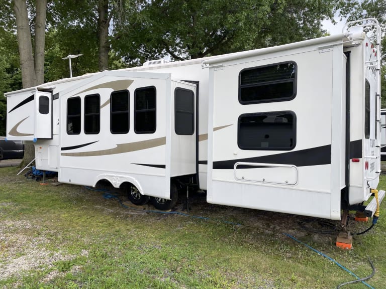 Everything you will need in a very well maintained fifth wheel! What's includedChairs, Linens, Small Blackstone Grill, Charcoal, Weed Wacker, Dishes, Vacuum, all the camping necessities RecommendationsThis rig has been everywhere from Michigan to Key West. Other things to noteThis is a very large camper, if you dont know what your doing please do not try to tow this unit. I offer delivery and I will work with you. No, your F150 can not tow this camper.