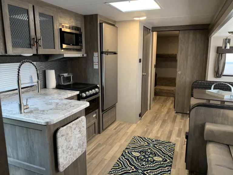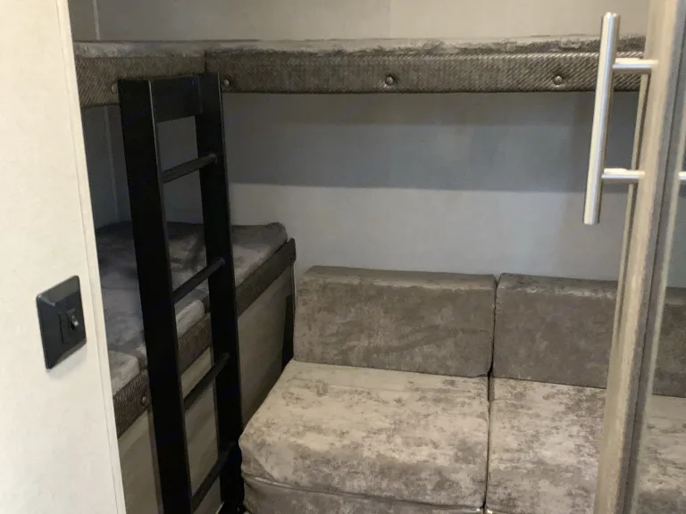 This trailer comfortably sleeps 11. 2 Bunk Beds, 3 Sofa Beds, and 1 Master Queen Bed. The bunkhouse is awesome. The master bedroom is conveniently located in the front. So many cool features in this model. Built in trash chute in the counter, beautiful counters, floors, fireplace, and much more!