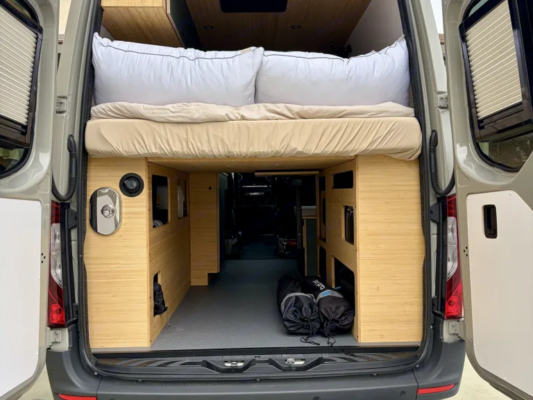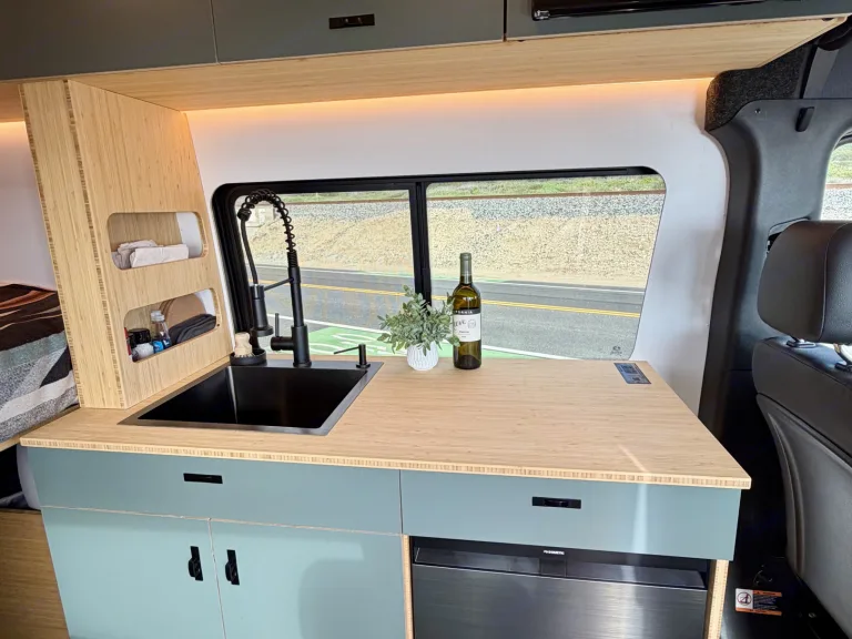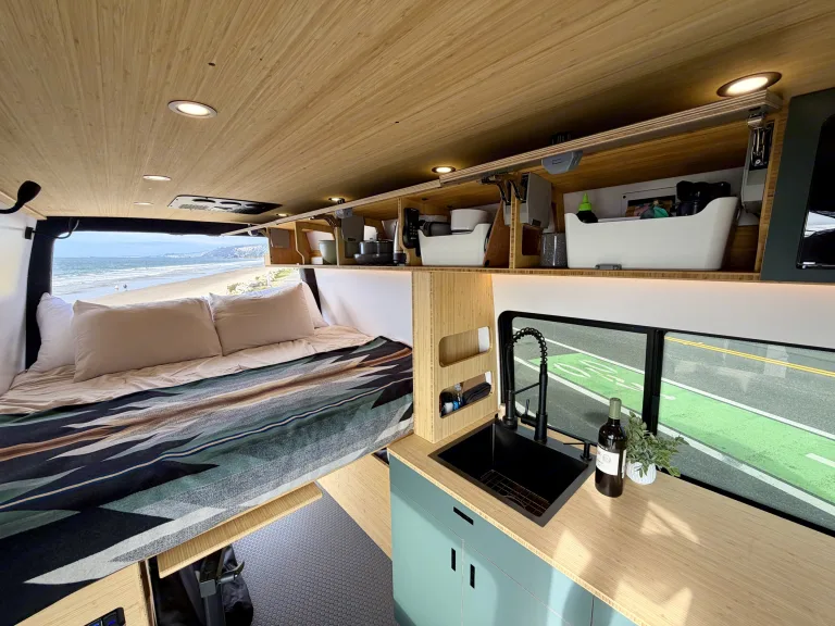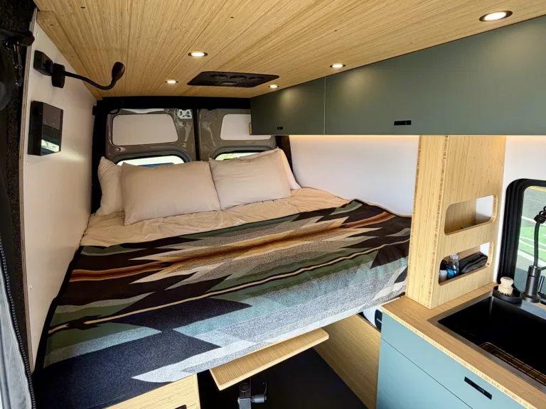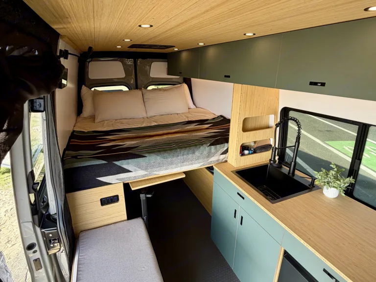 Modern rv rental camper van interior: wood ceiling, cozy bed, sleek kitchen with black sink, light green cabinets, and seating.. Mercedes-Benz Sprinter 2025