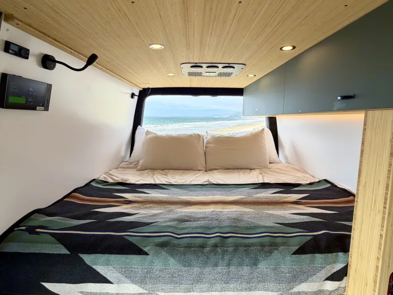 RV rental's modern interior: bamboo ceiling, cozy bed with patterned blanket, kitchenette & smart storage.. Mercedes-Benz Sprinter 2025