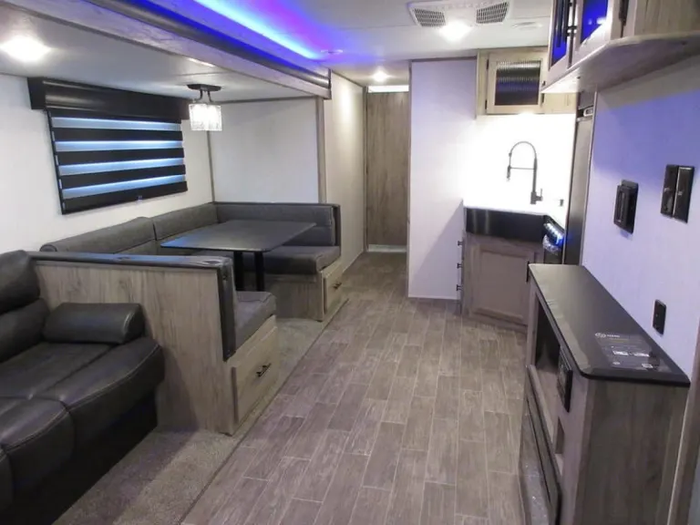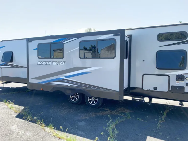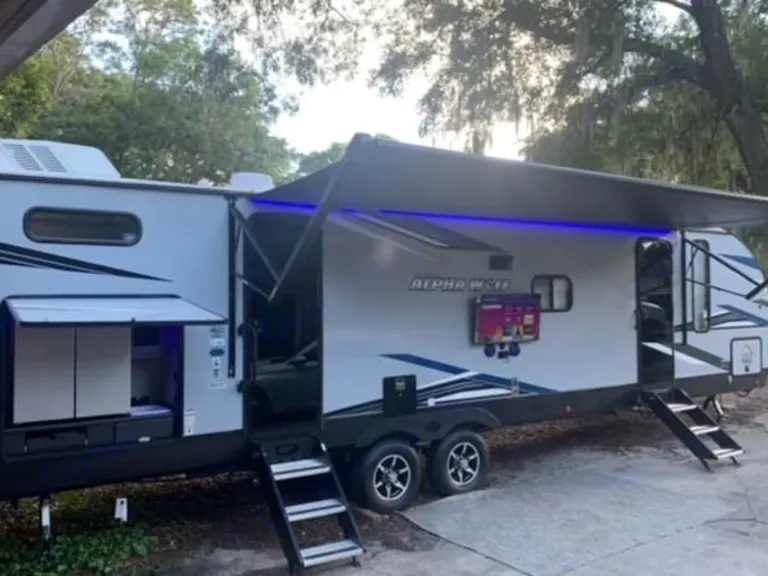 This beautiful NEW Forest River Alpha wolf luxury bunkhouse has room for the whole family! 2 bed room!!! Master has a queen size bed with plenty of storage, 2nd bedroom has 3 bunks. A large super slide with U-dinette and a couch that both make into beds. It is so roomy! 2ND entry do to the restroom, Full size shower & toilet. LED lighting, blue tooth stereo w/ speakers inside & outside. USB ports throwout the trailer. Outside has a full double fridge & freezer, sink & propane hook up for grill. "Grill not provided"