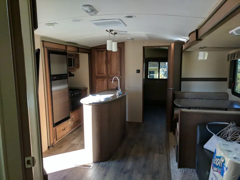 Great family trailer! 3 slides and a kitchen island make this trailer feel more spacious than other floor plans. 2 private bedrooms, a shower with headroom, upgraded mattresses and beautiful decor make staying in the trailer a real joy. Has an outdoor kitchen area with a sink, double burner stove and stowable grill and outdoor speakers. Must have a vehicle that can tow 8000 lbs. and has an electric trailer brake controller.This trailer does not have a generator so you will need shore power or your own generator.Includes all cookware, dishes, silverware, pod style coffee maker, linens for the queen bed and the full bunk and one twin. 4 bath towels, hand towels and cleaning supplies.For a great YouTube walkthrough of this model visit https://www.youtube.com/watch?v=Oy9qsST6xR8