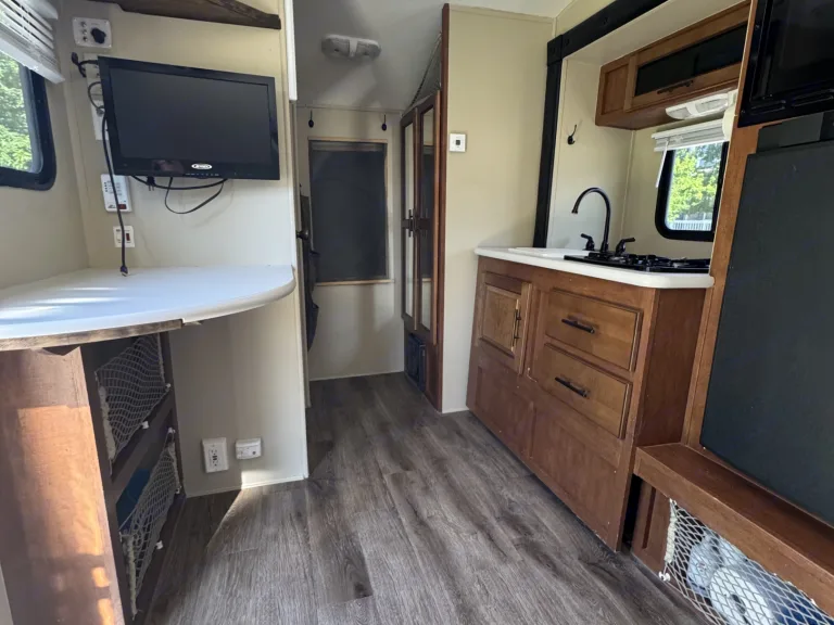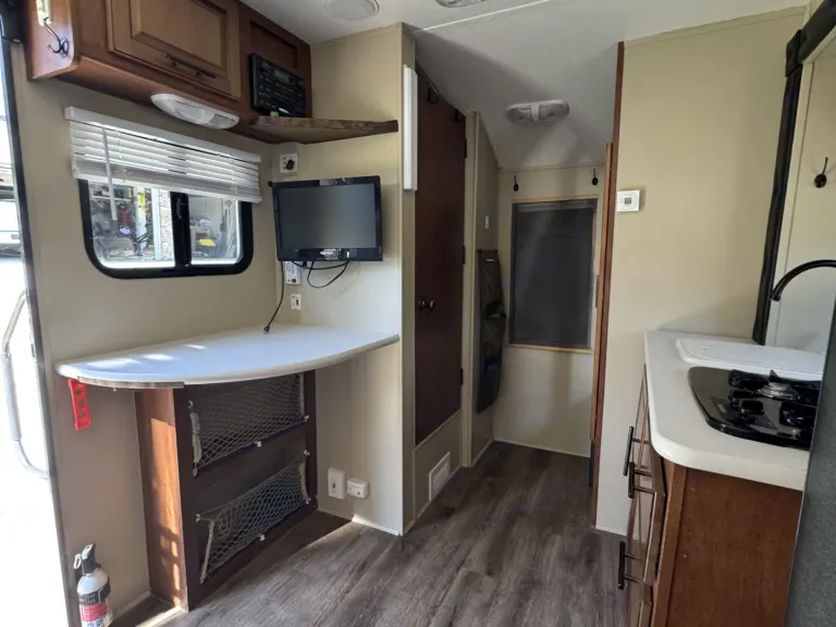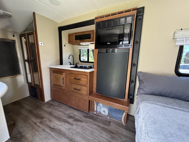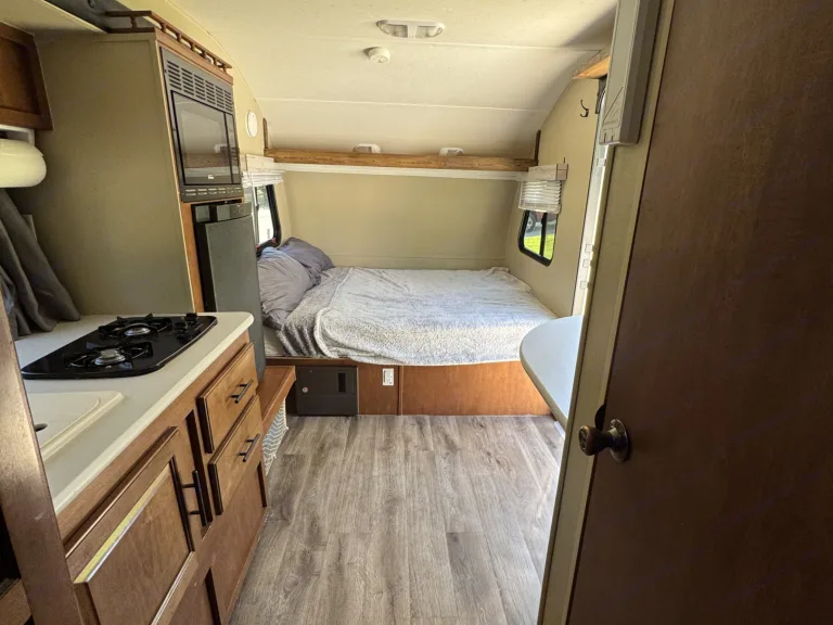 Looking for a budget-friendly camper for a quick getaway or a longer trip? This lightweight camper, just under 3,000 lbs, is easy to tow with most mid-sized SUVs. A weight-distributing anti-sway hitch and bluetooth trailer brake are included at no extra cost.Inside, you'll find a comfortable queen-sized bed that sleeps two, with space for a small child on a cot, air mattress or camping pad. To keep costs low, linens are not included, but a linen package (bedding, pillows, and towels) is available for just $75. The compact kitchen has everything you need, including a sink, two-burner stovetop, mid-size fridge, and microwave. Other features include a bathroom with a shower and toilet, air conditioning and heating, an outdoor shower and sink, a TV with Hdmi hookups, indoor and outdoor speakers, a removable shade cover, and a bike rack (available upon request).Even though it's small, this camper has plenty of storage inside and a large pass-through storage area outside for all your gear.Affordable rates & flexible pickup in Castle Rock.What's includedRental Includes: