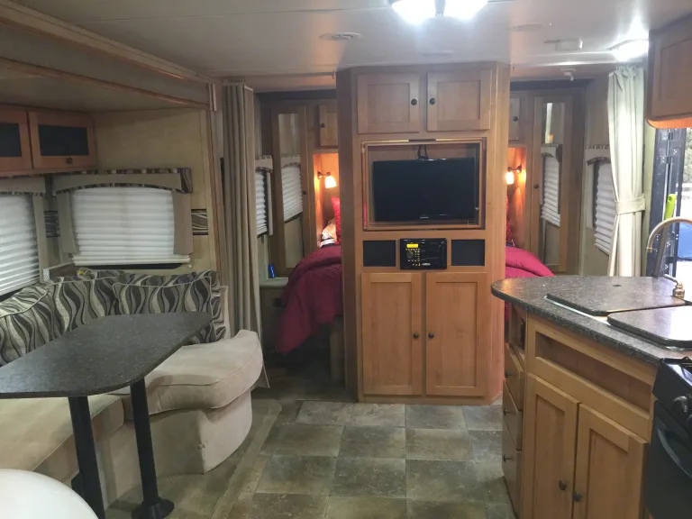 This is my very favorite floor plan of the light model rv. It sleeps 6. There is a rv queen bed in the front; the center of the rv, there is a large slide. Here’s one of my favorite features; instead of the slide containing the normal dinette and couch, the slide has a long couch booth that fits all 6 comfortably. We love playing games. The Two tables are conducive to games for the whole family. There is a nice little bathroom with a little tub. What our grandkids love the most is the little room at the back of the rv With 4 bunkbeds, or 3 bunks and a small dinette. Now for my husband’s all time favorite: a small Outdoor sink, burner, and minifridge. We can cook outside, while we enjoy the outdoors with everyone else. Oh, and it has an outdoor shower nozzle. The rv is not brand new, but Modern, and equipped with utensils, pots, and most basics. For the length, it is the light model, weighing in at less than 6000 lbs dry weight.