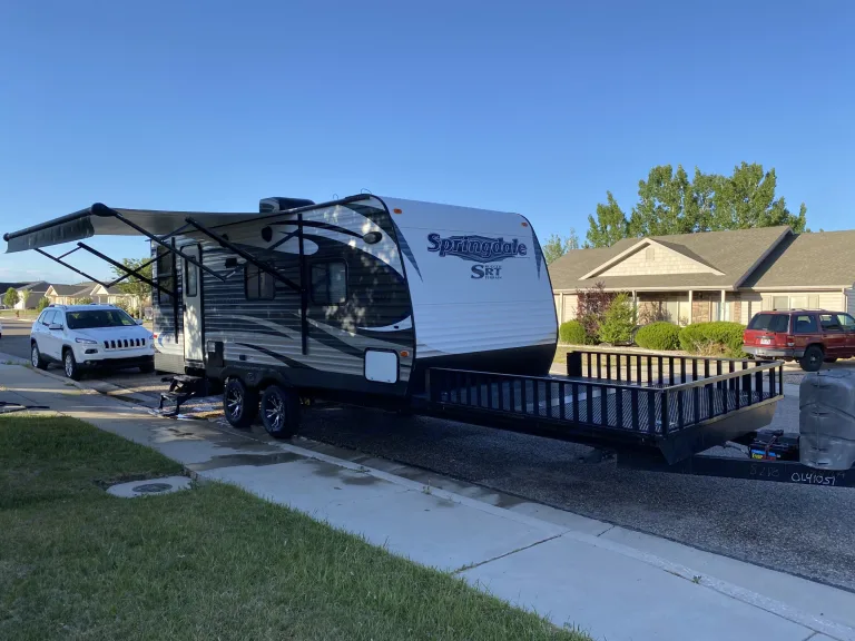 This rig is a 2016 trailer that has been kept in immaculate condition. It has hard wood floors, everything you need for a kitchen, a full bathroom including a tub that is perfect for giving kiddos a bath in, and a queen-sized bed. Heater, A/C and water heater make this a comfortable stay for nights or if the weather is not as great as you hoped. The hot cocoa and s'mores kits make for a great activity for kids or even a couple who needs a weekend away. The front of the trailer is a built in utility trailer so you can put coolers, grills, or toys on the front to keep them off the dirt at the campsite. We live within 100 miles of Zion National Park and Bryce Canyon. The rugged terrain package makes this the perfect trailer to go off the beaten path and get a true camping experience. What's includedFresh linens, a double camping chair, kid camping chairs, paper products, utensils.