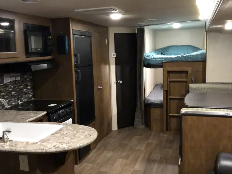 Our 2018 has one of the best floor models out. It has oversize bunk beds, outside entrants to the bathroom, outside shower, private queen, leather sofa bed and dinette bed.