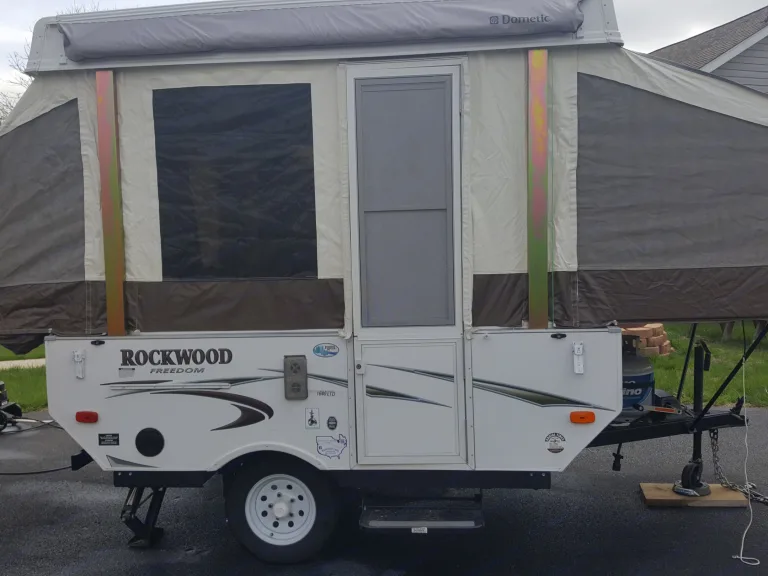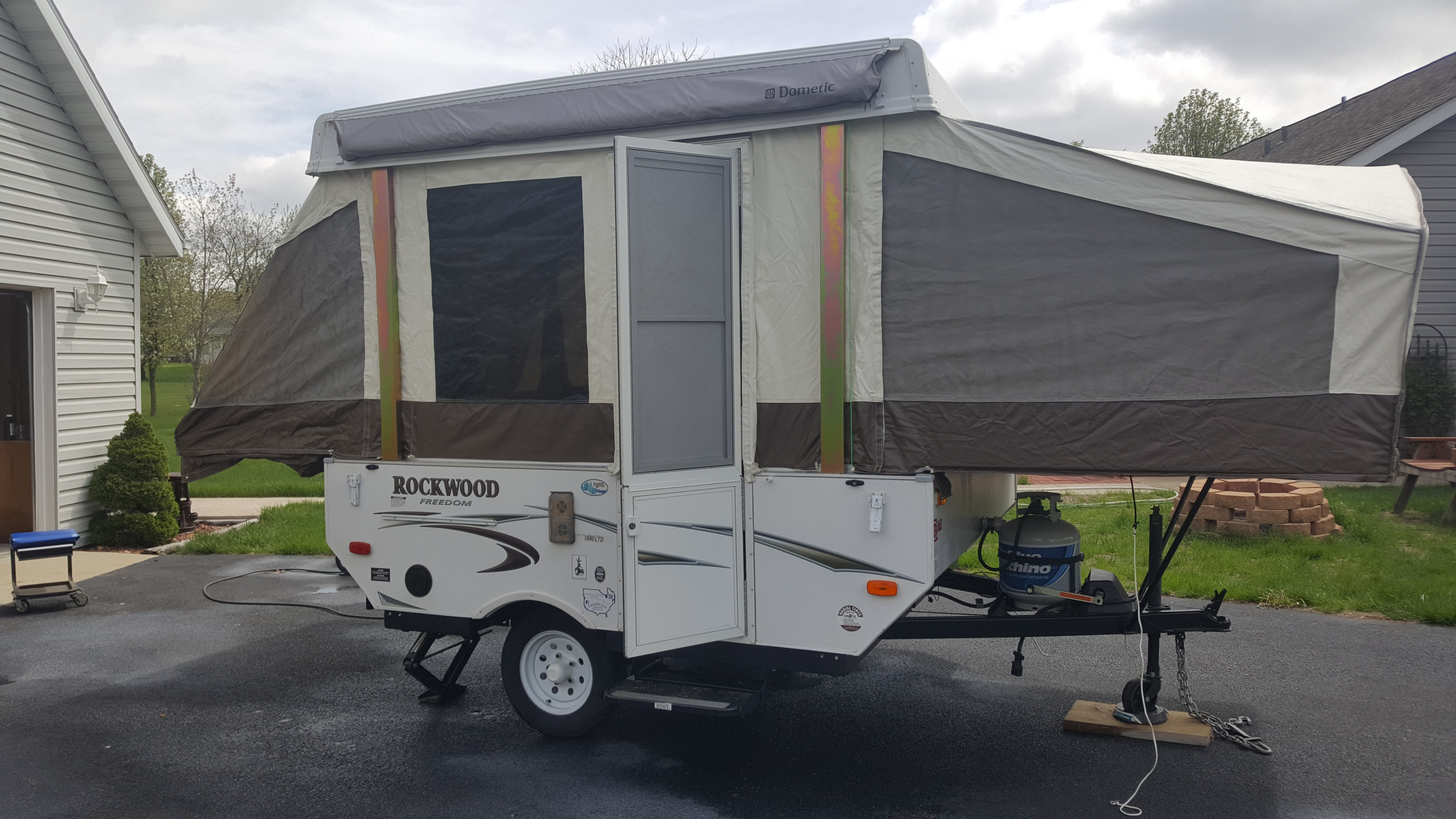 We have only used this 4 times. Sleeps 4 with a queen bed on one end and a full size on the other end. This unit does not have air conditioning. Direct water hookup