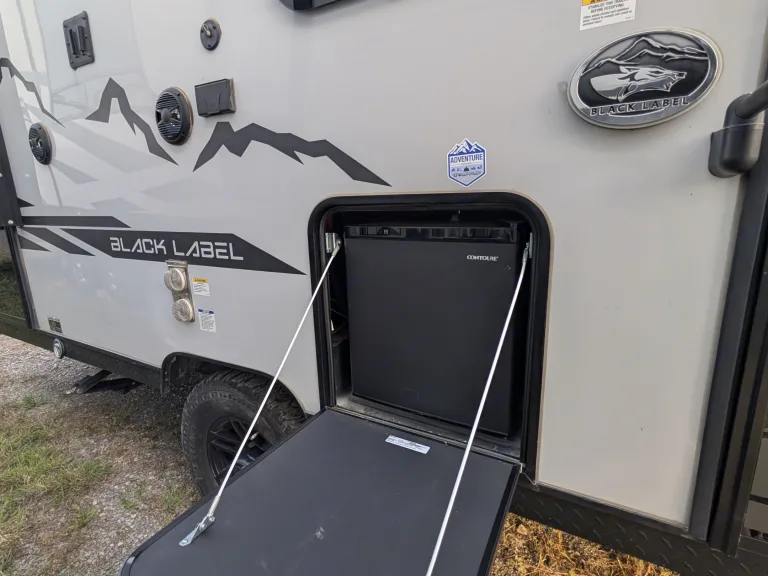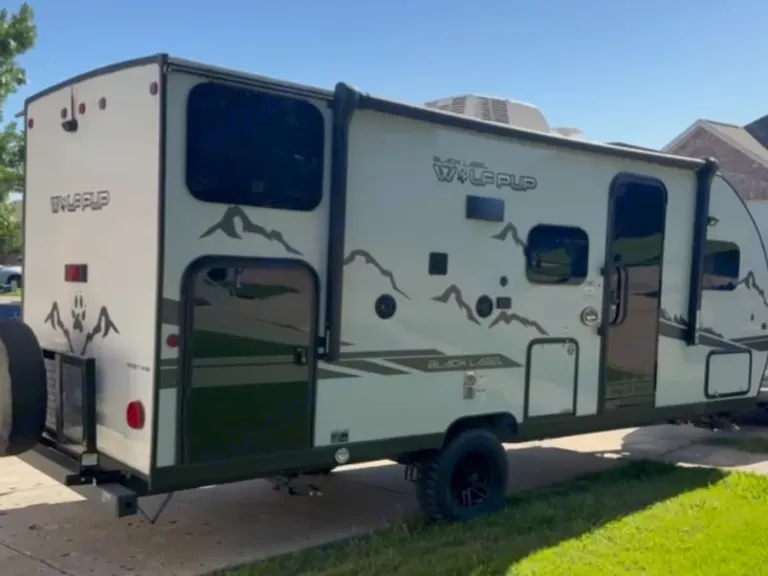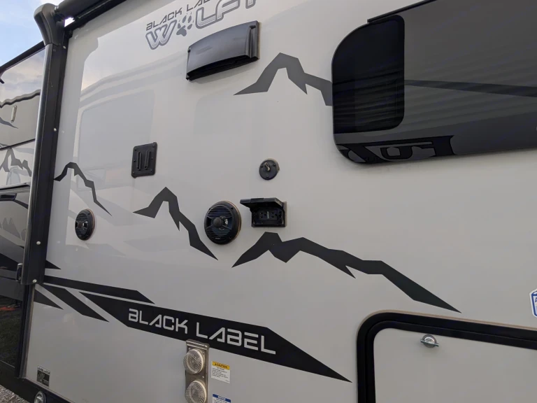 The Black Label label Cherokee wolf pup gives you an elevated style inside and out. With two bunks for small kids and a convertible dining table that turns into a full size bed, you can sleep five to six people in this comfortable travel trailer. With an outdoor mini fridge, shower, and TV mount, you can enjoy lounging inside or outside of this camper. The refrigerator and freezer are generously apportioned and the queen bed has a mattress topper making it incredibly comfortable to sleep on.