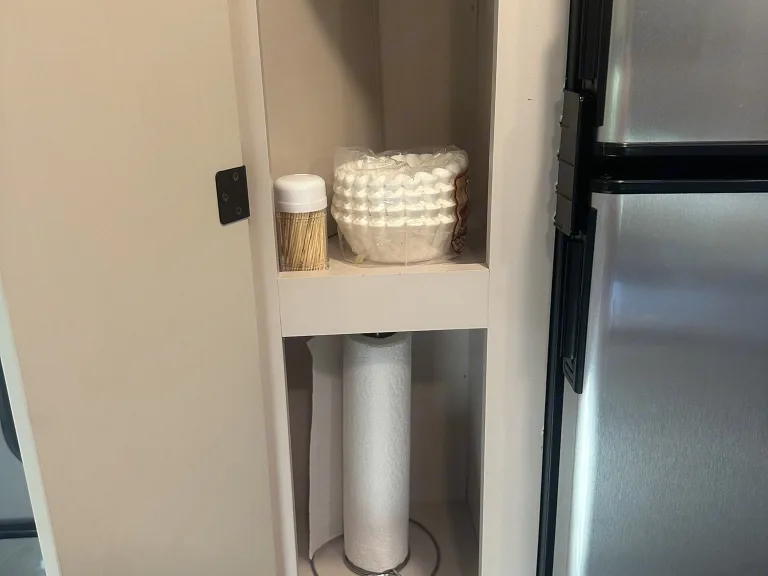 • Kitchen Amenities: Equipped with a 2-burner stove, induction stovetop, convection microwave (you can even cook a pizza in there), mid-size refrigerator and freezer(electric/propane), and a double sink with cover for meal preparation ease.