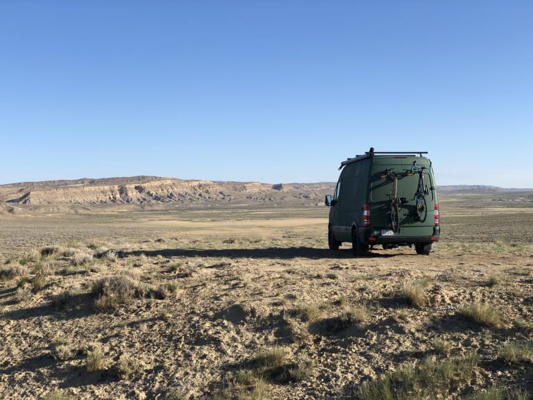 This rugged green adventure mobile is ready to take you to your next destination. We built this baby to take us rock climbing, skiing, paddle boarding, biking, hiking, and beyond. With a memory foam queen mattress, this van was customized for comfort and style. Just enough space for two and some furry friends, there is a dining area, tons of storage, small kitchen, and cozy bed.