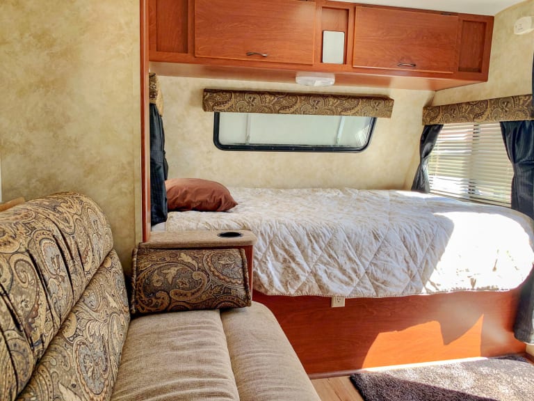 Like new camper trailer, clean clean clean!It is fully stocked with everything you need. Just pack your food and hit the road.This trailer is the perfect size for any small family or couples. And it has a slide out to give you even more space. Easy setup and easy to tow, includes free use of the weight distribution sway bar.The best part about this trailer is that it's light weight so SUV's, Jeeps, and small trucks can tow it.Rest peaceful with a real full mattress up front. And a bunk mat for the pull out sofa sleeper.All bedding and towels are included, as well as dishes, pots and pans, coffee maker, and silverware and cozy sleeping bags for chilly nights.1/4 Ton towable (dry weight is 2710lbs)-Dual power refrigerator AC or Propane-Air-conditioning and Heat-3300w generator included-10gal. Propane no extra charge like most rentals-Roof top A/C-Gas/Electric fridge & freezer-Gas/Electric 6-gal. Water heater- 10' Awning-Indoor toilet/tub/shower-Electric Microwave-2 burner gas stove top-Kitchen sink/faucet-Lots of storage space-2 full-size camping chairs-2 collapsible chairs-Folding portable table-Trash bags-Everything needed to park/level/set-up trailer-Hoses and fittings for hook-ups at campsites-Power cord with adapters for generator or electric hookups.-Hitch weight - 450 lbs.-Fresh water tank - 18 Gals.-Black water tank - 10 Gals.-Grey water tank - 15 Gals.**Please LET US Know IF YOU Like TO ADD Kayak ON TO Your RentalDon't miss out on this little gemWhat's includedAll bedding and towels are included, as well as dishes, pots and pans, coffee maker, and silverware and cozy sleeping bags for chilly nights.2 full-size camping chairs