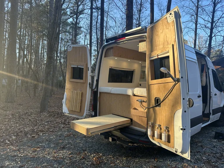 Step into a world of road trip luxury with our fully-equipped 2020 Sprinter campervan, Ringo the Van. It's not just a van – it’s an experience!Key Features:Unparalleled Comfort: Sleep soundly on a plush 5" memory foam mattress, with a cooling mattress cover.Gourmet On-the-Go: A 2-burner induction stove, coupled with all the essential cooking utensils, lets you whip up meals as if you were in your home kitchen.Spacious Storage: With floor-to-ceiling storage, eight overhead cabinets, and an exterior slide-out table that extends to 4 feet, you won't be leaving any essentials behind.Fresh & Clean Amenities: Enjoy the luxury of an outdoor shower equipped with a 4-gallon hot water tank. The water pressure is impeccable, and with a 36-gallon fresh water tank and 20-gallon easy-to-drain grey water tank, your convenience is guaranteed. (Water system can be used if temps are above 32°)Eco-Friendly Power: Stay charged wherever you park, thanks to our 400Ah Battle Born lithium batteries powered by 300W of solar, alternator charging and shore power plugin.Modern Conveniences: Multiple 110v and 12v outlets ensure your electronic devices, from laptops to cameras, always have juice. Plus, Apple CarPlay keeps you connected and entertained.Unique Features: Relish your evenings with cocktails atop our van, accessible by an aluminum ladder, offering a rooftop deck view that's perfect for sunsets.Laveo Dry Flush Toilet: A true luxury when on the road, ensuring clean, easy, smell-free bathroom visits.Dine or Doze: Our adaptable dinette-to-bed conversion ensures you have a space to share meals or to stretch out and rest.Whether you're looking to chase sunsets, explore nature's hidden gems, or simply escape the hustle and bustle, our Sprinter van promises a journey you won't forget. Book now and pave the way to your next adventure!What's includedCozy Linens: Cooling bed cover, linen comforter, flat sheet, two queen pillows, plus bath, quick-dry, hand towels, and washcloths.Camp in Comfort: Collapsible chairs for stargazing or morning coffee.Kitchen Set: Cooking utensils, salt, and pepper.Cookware & Dining: Pot, pan, plates, and cups.Stay Caffeinated: 20 oz French press with coffee grounds and cups.Extras for Adventure: Games, a portable rechargeable light, and an umbrella.RecommendationsNorth Carolina Adventures from Chapel Hill