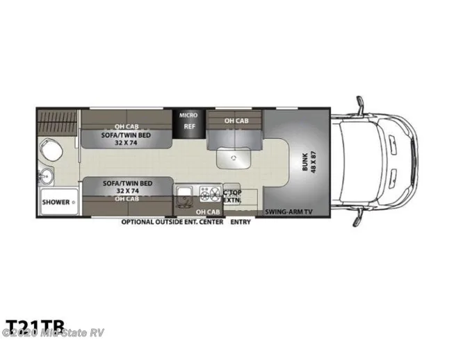 Upon entering the unit, you will view a 2-seat bench that converts into a small child-sized bed. Mid-ship lies the kitchen area followed by 2 bench seats that convert into single bed areas. A small table can be utilized at the front or the back for dining. In the far back lies the bathroom with standing shower, sink, commode, and a large storage area. Cabinets line the middle of the camper above the seating areas for storage. An above the cap bed can be used as an additional sleeping area or for storage.