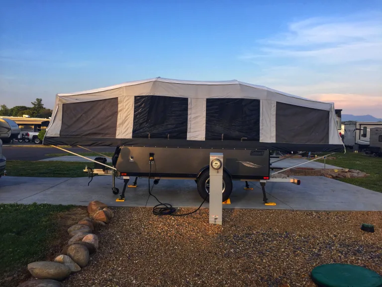 Our 2015 Livin Lite 10.0 is a roomy and light weight fold out camper (think pop up without the hard top). Can sleep up to 6; two queen size beds and one full from the convertible dinette. 30 amp hookup, has AC and a space heater. It does have water hookup but we rarely run water. All the seams have been water sealed with McNett Seam Grip. Lots of storage!